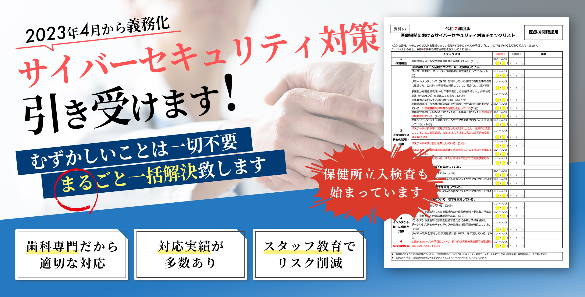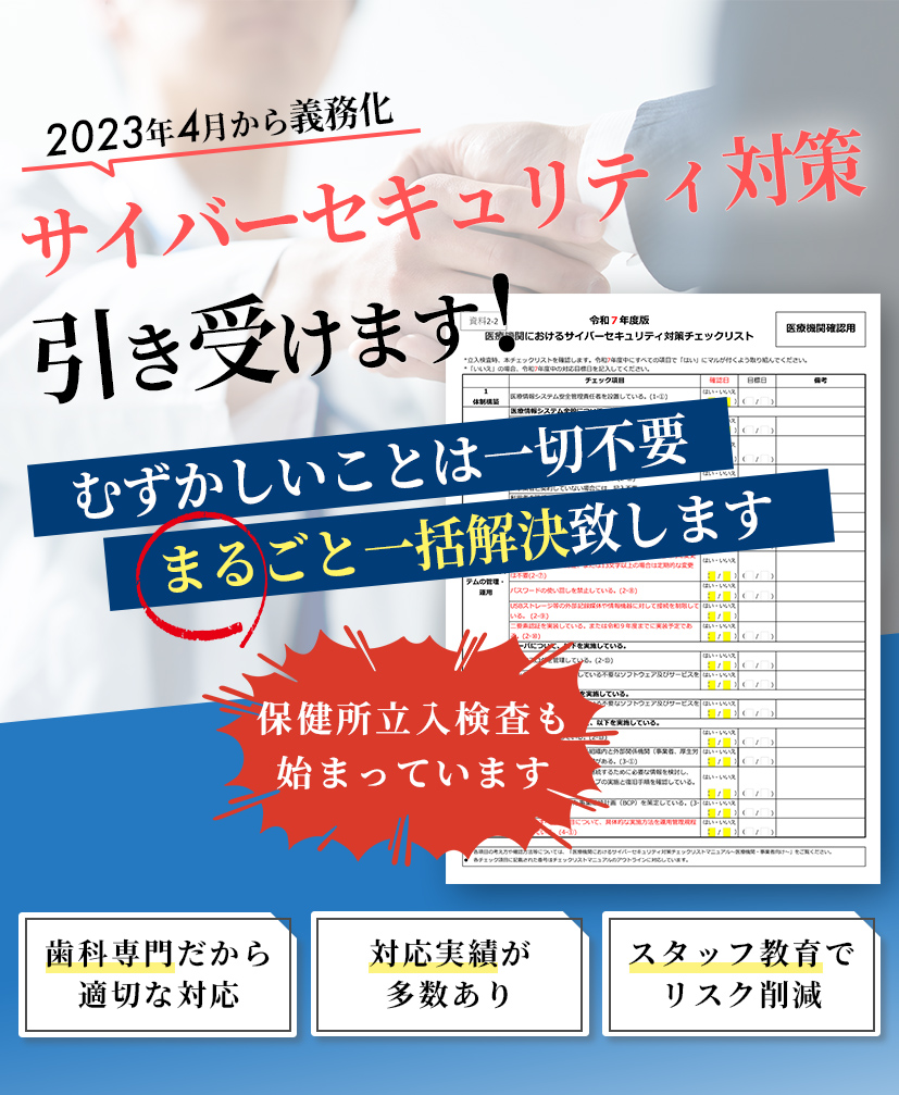現場の事情を熟知しているからこそ、「歯科医院でも実現できる」現実的なセキュリティ対策をご提案します。
